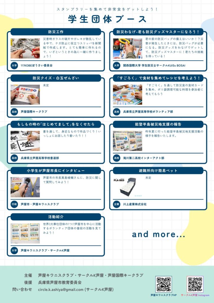 また15:00からの学生団体ブースでは書道部は書を通して身近なもので作品作り、ボランティア部はすごろくを使って楽しくポリ袋で調理可能な料理を考える企画をします。
