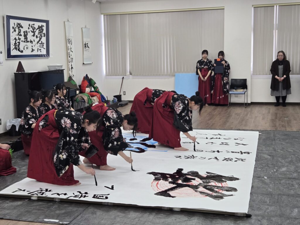 さらに3グループに分かれて、茶道体験、剣道体験、ソーラン節体験を実施し、最後に執行部、吹奏楽部、書道部、応援団らで歓送セレモニーで締めくくりました。