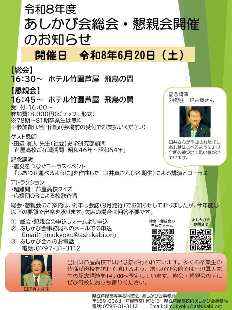 当日、芦屋高校では記念祭が行われています。多くの卒業生の皆様が母校を訪れて頂けるよう、あしかび会館では田辺眞人先生の記念講演を14:00~予定しています。総会・懇親会の前にぜひ母校にお立ち寄りください。