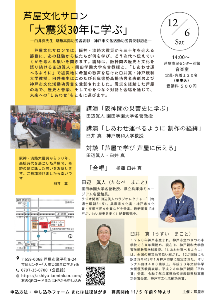かつて芦屋高校で教職に就かれていた田辺眞人先生(社会科 芦高在職:昭和46~55年・園田学園大学名誉教授)と卒業生で阪神・淡路大震災の復興と鎮魂を願い、合唱曲「しあわせ運べるように」を作詞作曲された臼井(上岡)真さん(34期生・神戸親和大学教授)が、芦屋市民センター別館の音楽室で講演会『大震災30年に学ぶ』の講師としてお話されます。